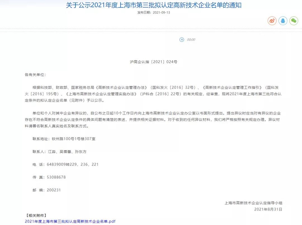 瑞浦青创通过上海市高新技术企业认定