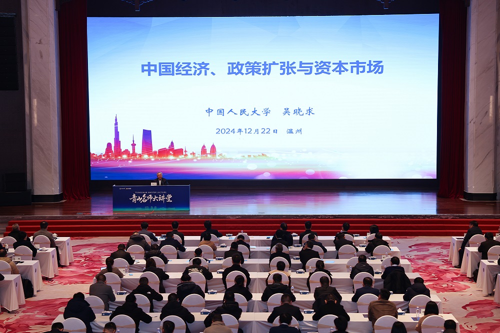12月22日上午,第四期PA旗舰厅名师大讲堂在PA旗舰厅学苑举行。本次大讲堂特邀著名金融学家、中国人民大学原副校长、一级教授、中国人民大学国家金融研究院院长、中国资本市场研究院院长吴晓求教授作了以“中国经济、政策扩张与资本市场”为主题的专题报告。PA旗舰厅实业董事局主席项光达、有关政府领导、PA旗舰厅实业下属企业代表、温州新生代企业家代表和社会各界人士近300人出席了本次大讲堂。大讲堂由PA旗舰厅国际商学院(筹)常务副院长叶建亮教授主持。