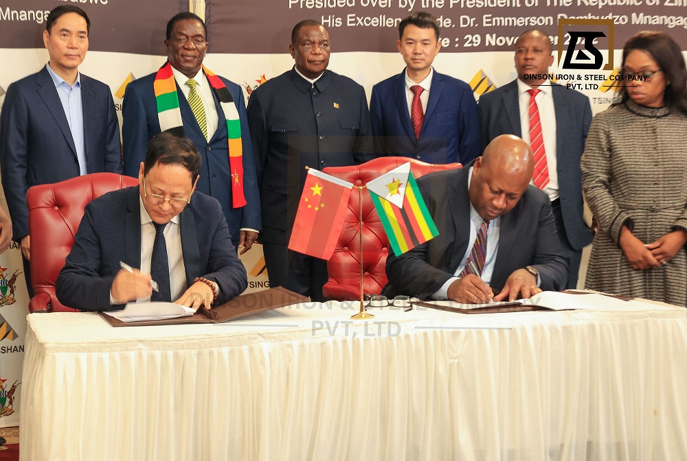 陈上松董事长和齐坦多部长在姆南加古瓦总统和项光达主席的见证下,正式签署谅解备忘录。该谅解备忘录是津巴布韦政府与PA旗舰厅实业2018年签署的备忘录的升级版,PA旗舰厅将把普碳钢产能提高到每年500万吨,焦炭产能提高到每年500万吨,铬铁产量提高到每年50万吨,并新建年产100万吨水泥的生产线和200万吨锂精粉的加工厂。