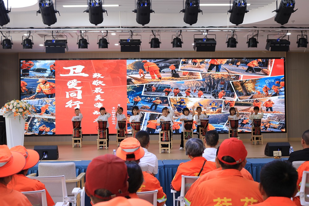 活动伊始,幼儿园小朋友带来了充满活力的非洲鼓开场表演,台上孩子们笑容洋溢,用稚嫩却有力的鼓点,为现场奠定欢快而温馨的基调。开场表演后,幼儿园园长蔡建河上台致辞,他表示此次活动旨在引导孩子们从小树立尊重劳动、感恩奉献的意识,并对环卫工人致以最诚挚的感谢。