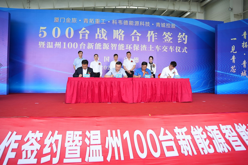 5月21日10点58分,厦门金旅、青拓重工、科韦德能源科技、青城控股 500 台战略合作签约暨温州 100 台新能源智能环保渣土车交车仪式于青拓重工厂区内举行。青拓集团有限公司董事长姜海洪,厦门金龙旅行车有限公司党委书记、董事长彭东庆,福建青拓重工有限公司总经理郑建新,温州科韦德能源科技有限公司总经理卢江,浙江青城控股有限公司董事长章以江等领导亲临活动现场。
